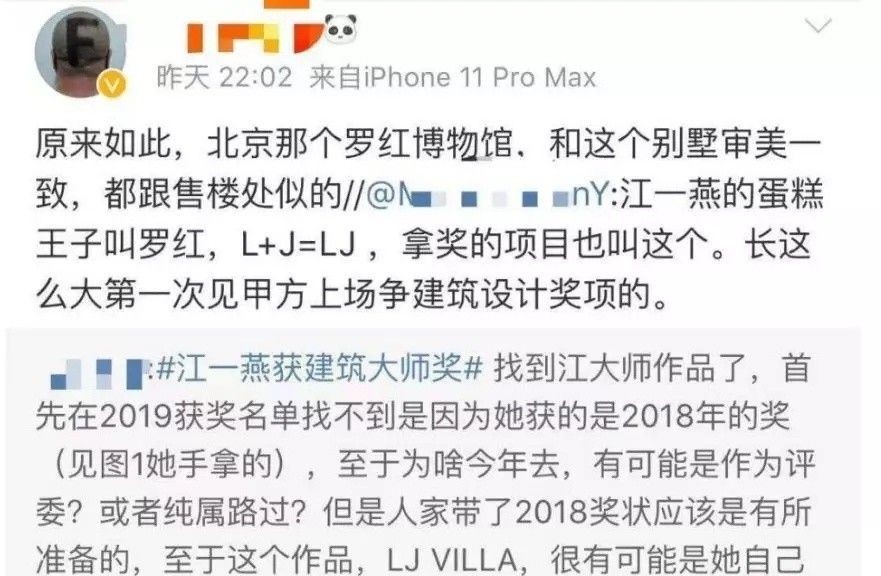 2019年9月,江一燕在社交平台发布一组照片,首张为印有“美国建筑大师奖(Architecture Masterprize)”字样的荣誉证书,后续则是她在一栋极简风格白色别墅前的留影。